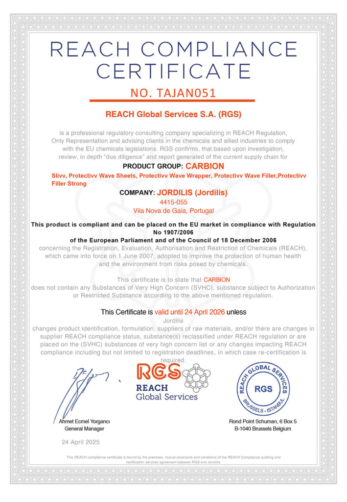 A Jordilis tem o orgulho de anunciar que os seus produtos da linha Slivv e Protectivv – Wave Sheets, Wrapper e Fillers — estão oficialmente em conformidade com o regulamento REACH (Regulamento CE nº 1907/2006). Esta certificação reforça o nosso compromisso com a sustentabilidade, a segurança do consumidor e o cumprimento rigoroso das normas da União Europeia.