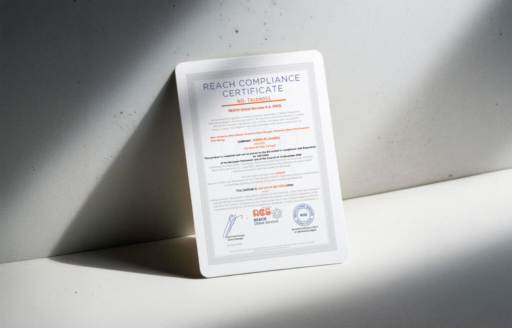 A Jordilis tem o orgulho de anunciar que os seus produtos da linha Slivv e Protectivv – Wave Sheets, Wrapper e Fillers — estão oficialmente em conformidade com o regulamento REACH (Regulamento CE nº 1907/2006). Esta certificação reforça o nosso compromisso com a sustentabilidade, a segurança do consumidor e o cumprimento rigoroso das normas da União Europeia.